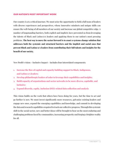 OUR NATION’S MOST IMPORTANT WORK Our country is at a critical juncture. We must seize the opportunity to field a full team of leaders with diverse experiences and perspectives, whose innovative mindsets and unique skills can ensure the well-being of all members of our society and increase our global competitive edge. A number of longstanding barriers, both explicit and implicit, have prevented us from leveraging the talents of Black and Latino/a/x leaders and applying them to our nation’s most pressing problems. The best way to move the sector forward is to enact a systems change solution that addresses both the systemic and structural barriers and the implicit and social ones that prevent Black and Latino/a/x leaders from contributing their full talents and insights for the benefit of our society.