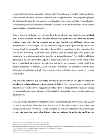 resources to bring about change at a systemic scale. The root cause of our DEI challenges lies in a series of conditions, both structural and social, that have prevented us from progressing beyond the status quo. We must develop a new set of actions that brings people together, removes barriers to opportunity for Black and Latino/a/x leaders, and draw on the innovations and creativity of all members of our national community. By targeting systemic barriers, we will transform the social sector in a way that empowers Black and Latino/a/x leaders who see the multi-dimensional root causes of issues and respond to these issues with effective products and services that integrate different cultures and perspectives.11, 12 For example, the 2017 Unrealized Impact Report sponsored by NewSchools Venture Fund in partnership with others found that organizations in the education field with diverse leadership teams were almost twice as likely to include input from parents and students in their solution design than less-diverse leadership teams.13 There is little additional quantitative data on the positive impact of Black and Latino/a/x leaders in the social sector, but a growing body of research concludes that private sector companies benefit greatly from diverse leadership; for example, a 2018 McKinsey study found that companies with the most ethnically/culturally diverse leadership teams are 33% more likely to outperform their peers on profitability.14 The pervasive nature of our leadership diversity issue necessitates that players across the social sector collectively enact systems change. We believe that systems change is possible, but it requires all of us to actively engage in concerted efforts to bring about the necessary change. Dr. Judith Rodin, the former President of the Rockefeller Foundation, shares her view on why we must act now: In the last century, philanthropy changed the world in ways many thought never possible. Our capacity to create transformative change has never been greater. We have more resources, more connections, more possibilities than ever before. And by leveraging the explosive capabilities of new technology, we have the power to ensure that diverse voices are included in solving the problems that
