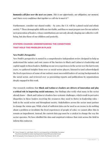 humanity will face over the next 100 years. This is our opportunity, our obligation, our moment, and I have every confidence that together we will rise to meet it.15 Furthermore, consider our shared reality – by 2060, the U.S. will be a plural racial and ethnic society.16 These demographic shifts are inevitable, and thus we must prepare now for our nation’s next generation of leaders, whose contributions are not only already shaping our collective wellbeing, but also those of our children and posterity. SYSTEMS CHANGE: UNDERSTANDING THE CONDITIONS THAT HOLD THE PROBLEM IN PLACE New Profit’s Perspective New Profit’s perspective is rooted in a comprehensive independent review designed to help us understand the nature and root causes of the barriers to Black and Latino/a/x leadership and capital supply to those leaders. Building on our own experiences in the sector over the last twenty years, we gathered insights from over 50 social sector players, listened to (and acknowledged) the lived experiences of some of our nation’s most successful leaders of varying backgrounds in the social sector, and reviewed over 30 preexisting reports and publications by organizations deeply engaged in this work. Our research confirms that Black and Latino/a/x leaders are drivers of innovation and play a critical role in improving social outcomes. Our findings also verify what many in the sector already know – Black and Latino/a/x leaders face systemic challenges, which result in pervasive disparities in these leaders receiving the resources they need to thrive in leadership roles – both in the social sector and throughout society. Stakeholders across the sector must partner to change the status quo. While a lack of sufficient data can be used as an excuse to do nothing about a problem or invalidate the lived experiences of people of color, we cannot allow this to remain an impediment. Instead, the current data gap must be a catalyst to change the way the sector operates. We have distilled the data and empirical evidence that exist across the field to inform this endeavor.