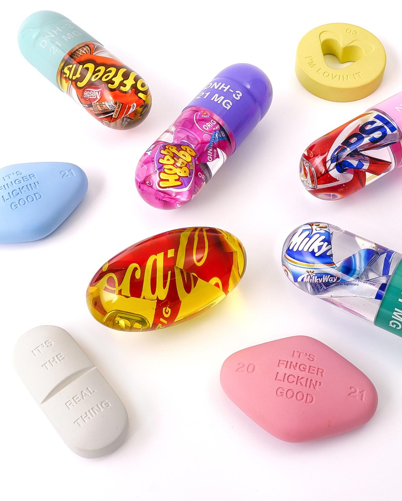 Art Miami 2022 | Burges Modern + Contemporary | 8 Miss Bugs JunkCaps,2022 Polyurethane UV resin + pigment with encapsulated discarded food wrapper 5.118 inches | 13 cm length x 1.77 inches | 4.5 cm diameter / 2.16 inches | 5.5 cm height TheDispensary800collection
