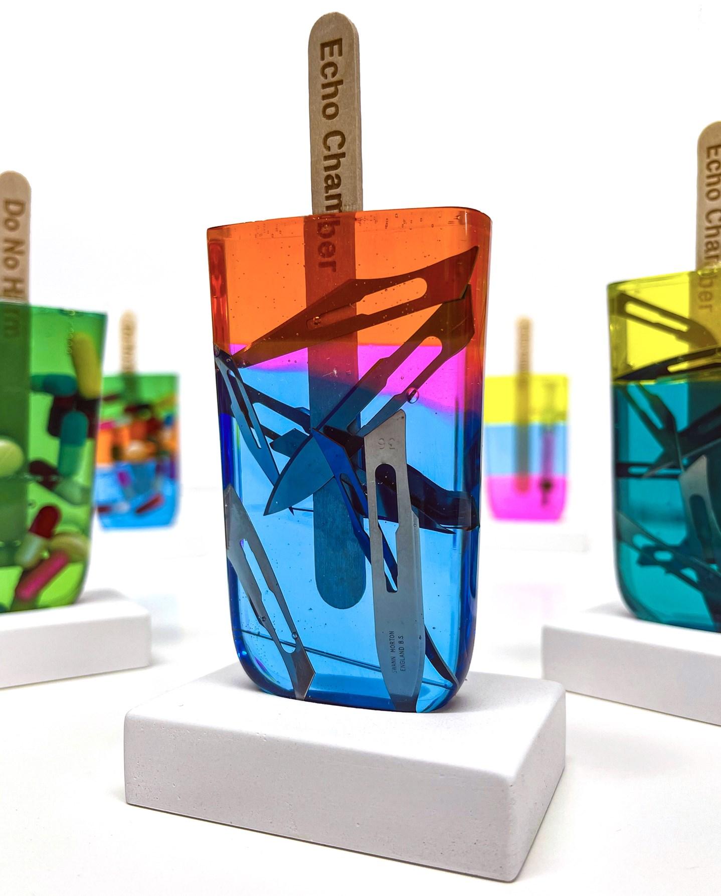 2021 22 Polyurethane UV resin + pigment with encapsulated razor blades, pills, and syringes 5.50 inches x 2.50 inches x 1 inch