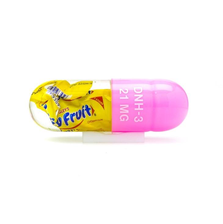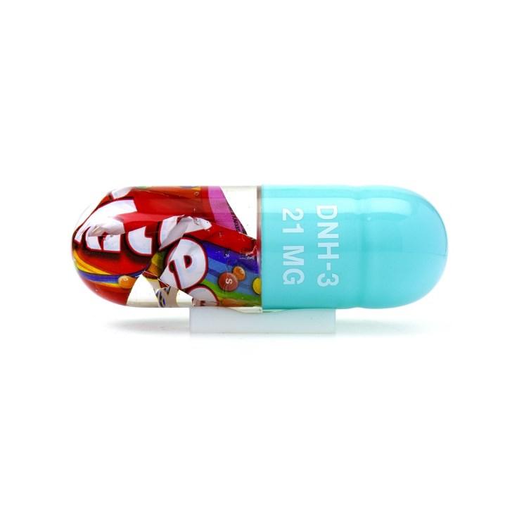 Bugs JunkCaps,2022 Polyurethane UV resin + pigment with encapsulated discarded food wrapper 5.118 inches | 13 cm length x 1.77 inches | 4.5 cm diameter / 2.16 inches | 5.5 cm height TheDispensary800collection