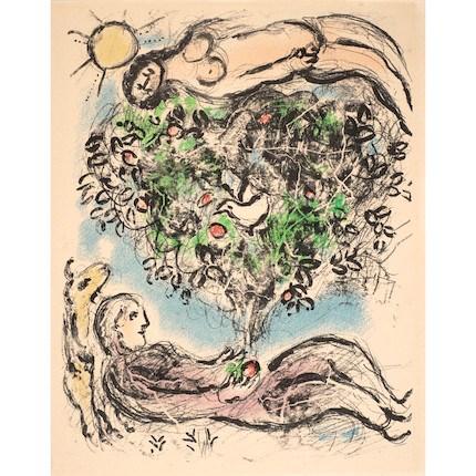 L'ArbreFleuriI(FloweringTreeI),1977, (81/100) Lithograph in colors on Arches paper, folded, with printed title, pencil signature and edition number 81/100 on the reverse, the cover page of the deluxe edition of the exhibition catalogue Marc Chagall: Peintures récentes 1967 1977, Musée du Louvre, Par 13 x 10.25 in