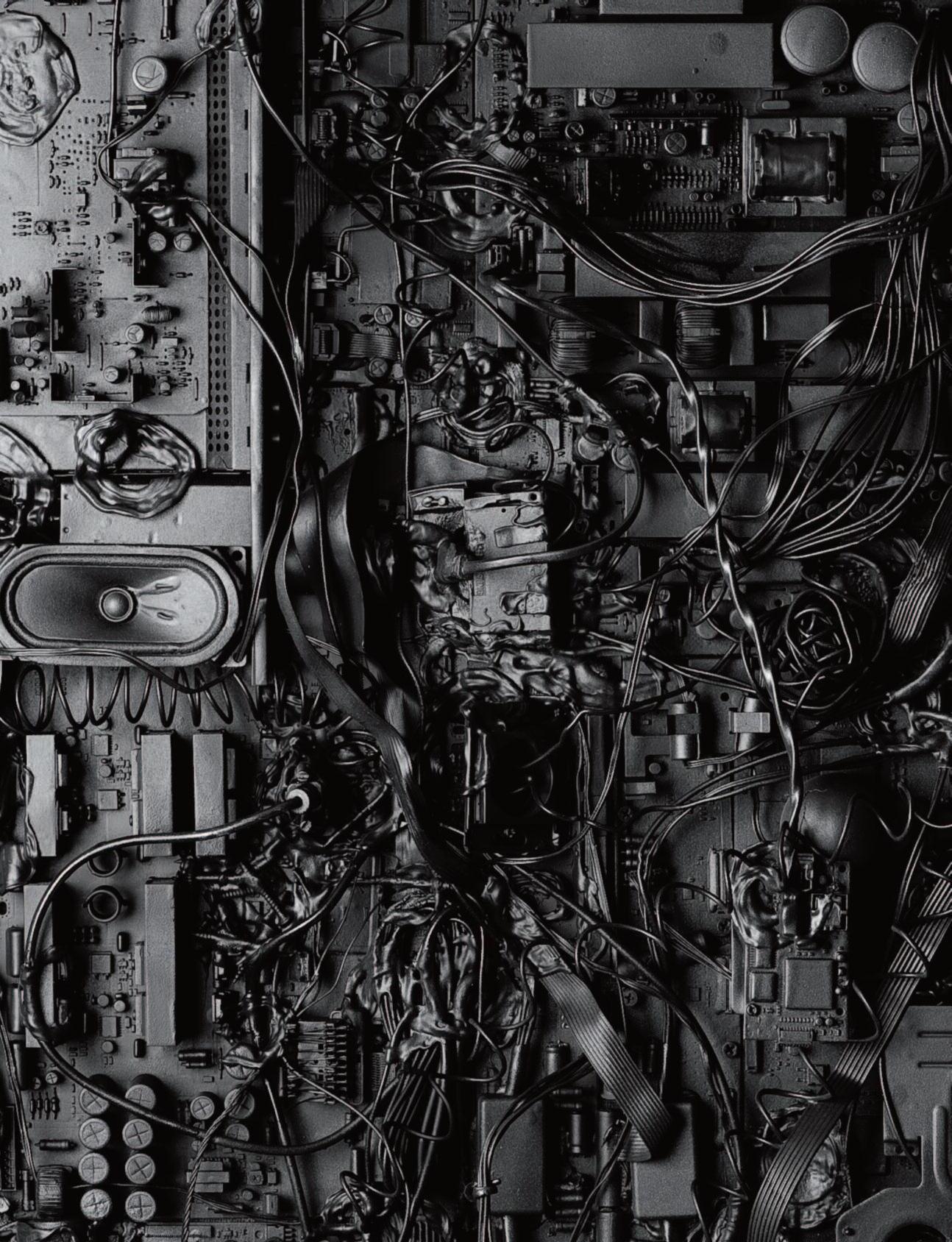 Chaînes, clous, boulons, bouteilles de lait, disques, câbles, ordinateurs, téléviseurs, radios, ampoules, batteries et tout type d’appareils électroniques afin de réorganiser les transformer en peintures ou sculptures