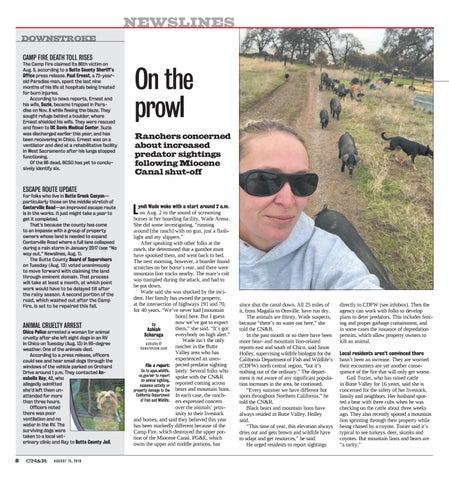 She did some investigating, “running around [the ranch] with no gun, just a flashlight and my slippers.” After speaking with other folks at the ranch, she determined that a gunshot must have spooked them, and went back to bed. The next morning, however, a boarder found scratches on her horse’s rear, and there were mountain lion tracks nearby. The mare’s colt was trampled during the attack, and had to be put down. Wade said she was shocked by the incident. Her family has owned the property, at the intersection of highways 191 and 70, for 40 years. “We’ve never had [mountain lions] here. But I guess now we’ve got to expect by them,” she said. “It’s got Ashiah everybody on high alert.” Scharaga Wade isn’t the only as h i a h s @ rancher in the Butte n ew srev i ew. c o m Valley area who has experienced an unexFile a report: pected predator sighting Go to apps.wildlife. lately. Several folks who ca.gov/wir to report spoke with the CN&R an animal sighting, nuisance activity or reported coming across property damage to the bears and mountain lions. California Department In each case, the ranchof Fish and Wildlife. ers expressed concern over the animals’ proximity to their livestock and homes, and said they believed this year has been markedly different because of the Camp Fire, which destroyed the upper portion of the Miocene Canal. PG&E, which owns the upper and middle portions, has