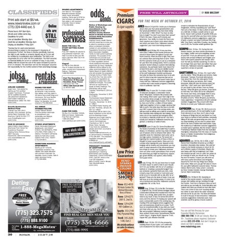 Print ads start at $6/wk. www.newsreview.com or (775) 324-4440 ext. 5 Phone hours: M-F 8am-5pm. All ads post online same day. Deadlines for print: Line ad deadline: Monday 4pm Adult line ad deadline: Monday 4pm Display ad deadline: Friday 2pm
