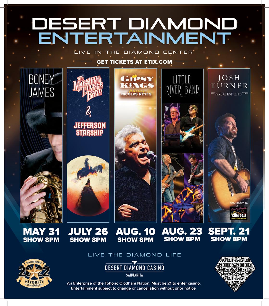 ¡Ven a Gozar! Te esperan tus juegos favoritos, deliciosa comida, el mejor entretenimiento a nivel internacional, un spa rejuvenecedor y lujosas habitaciones. Descubre todo eso y más en El Sol de Tucson, Casino Del Sol. EMPRESA DE LA TRIBU PASCUA YAQUI CASINODELSOL.COM • 1.520.838.6506 Regístrate en Club Sol y gana FreePlay, boletos para conciertos, comidas, participa en promociones exclusivas y mucho más.