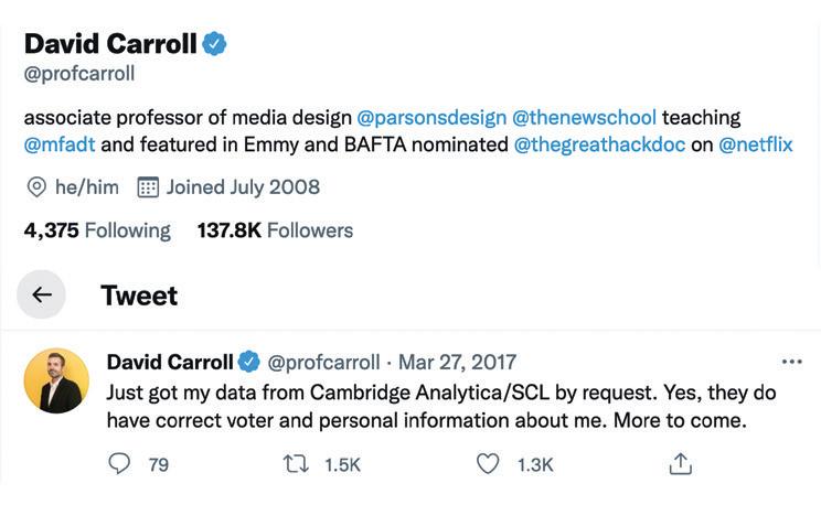 (page 33) @profcarroll, David Carroll’s Twitter account, where he shares and discusses information regarding data rights, ethics, and technology.