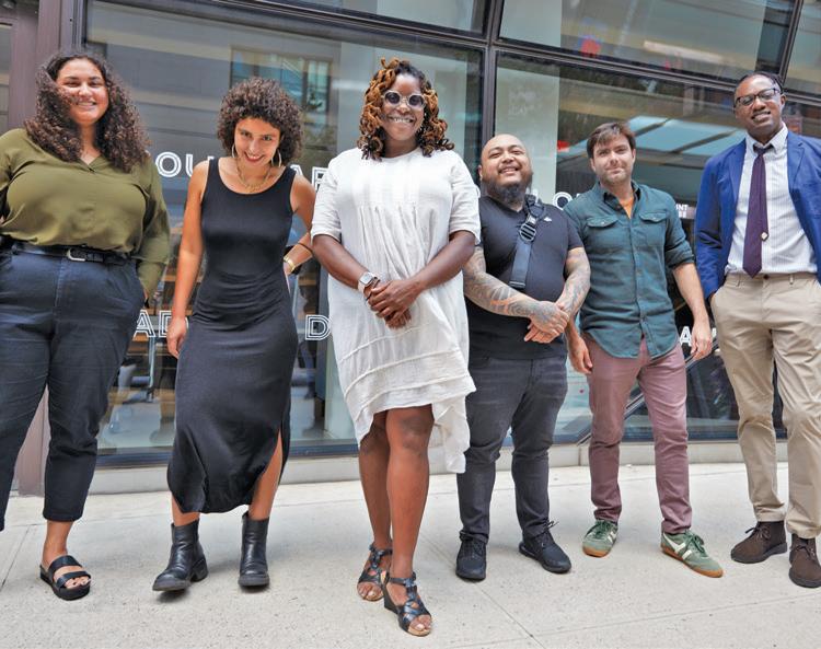 (page 40) FROM LEFT TO RIGHT: Sonia Inam, program manager for the Mellon Initiative for Inclusive Faculty Excellence; Romy Opperman, Philosophy postdoctoral fellow; Deva Woodly, faculty director; P.J. Gorre, dissertation fellow; Emmanuel Guerisoli, Mellon Initiative research assistant; Jonathan Square, postdoctoral fellow at Parsons’ School of Art and Design History and Theory, at the Mellon Initiative for Inclusive Faculty Excellence kickoff event.