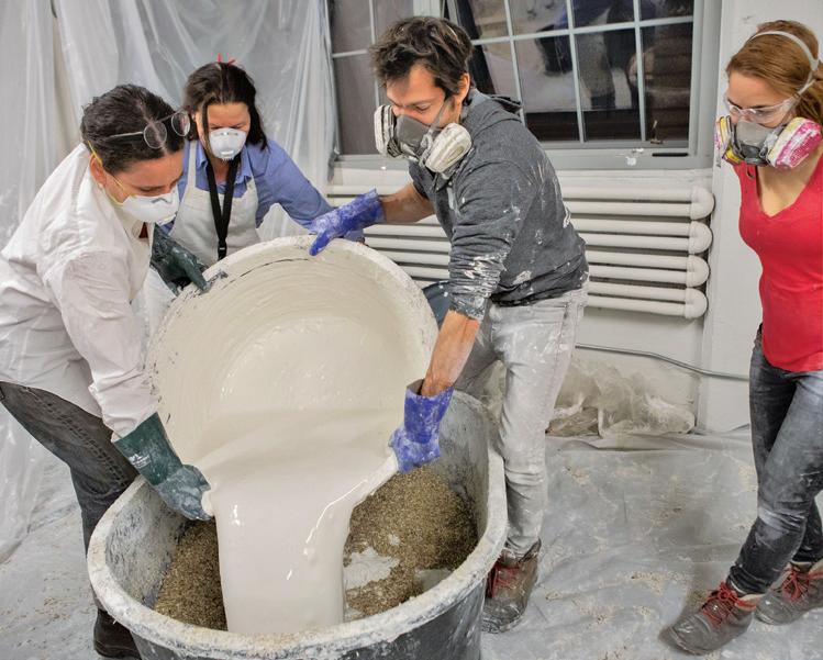(page 27) Healthy Materials Lab members and Parsons architecture and design students mixing hemp and lime at an HML workshop led by experts from CoExist (photo: Michelle Gevint, MFA Photography ’14).