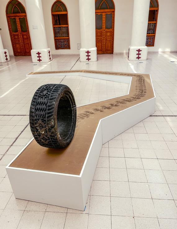 ABOVE: Almarzouq’s Traces of Nostalgia includes this piece in which a tire—a product made with petroleum, a resource whose discovery has profoundly shaped Kuwait’s identity—is patterned with traditional Kuwaiti textile designs. The tire tracks are meant to remind viewers of the impact the petroleum industry has had on Kuwait’s physical, economic, and cultural landscape. BELOW: A collage juxtaposes items reflecting Kuwait’s cultural heritage with artifacts of the petroleum industry.