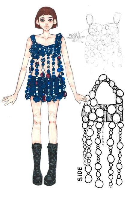 Gu created the bottle holder for a partnership between the BFA Fashion Design program and Burch, which took the form of a sweeping Project Runway–like design competition. All 268 students in the program’s junior class participated in the challenge at the beginning of the spring semester. Each received a mystery package of production samples, material, and trimmings or packaging donated by Burch’s label, along with the challenge of upcycling them. Students had three weeks to conceptualize and construct a piece and to sketch or digitally render an accompanying capsule collection of eight looks. Their creations had to embody the design language of the Tory Burch brand—a timeless, relaxed East Coast glamour. After the projects were completed, the Parsons faculty leads chose eight finalists to present their designs to Burch. The finalists were competing for three paid summer internships at Burch’s New York headquarters—a highly covetable prize for an ambitious young designer.