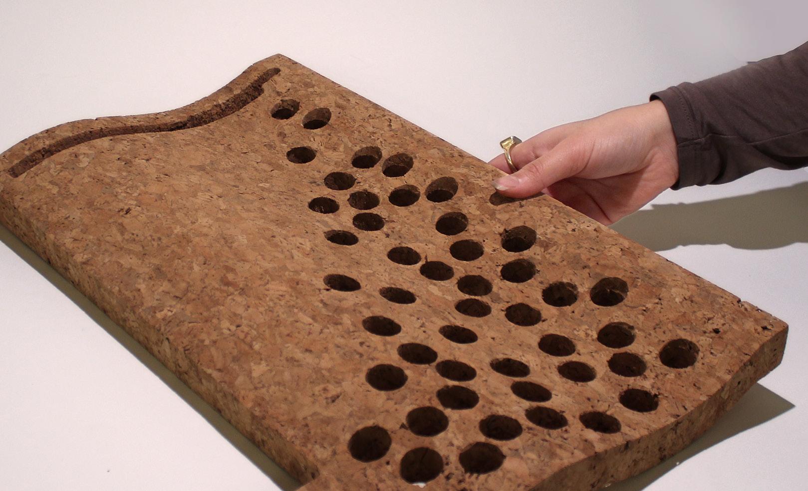 BELOW: Quinn created a product, shown here, that can serve as a stool or a table. Its elements are joined with wine corks used as connecting pins—an ingenious and practical feature. In their projects, students made use of attributes of cork including its flexibility, moldability, fire and water resistance, and ability to insulate by reducing the transfer of sound and heat.
