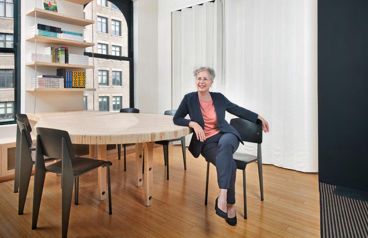 Executive Dean Schreiber is shown in her office, designed by Jordana Maisie Design Studio. Maisie, a 2016 graduate of Parsons’ MArch/MFA Lighting Design dual-degree program, created the office, called Stacked Space, using sustainable safer materials sourced with Parsons’ Healthy Materials Lab and provided mainly as in-kind donations. Shown are Columbia Forest Products plywood, made from responsibly sourced wood and a soy-based binder; nontoxic mineralbased Romabio paint; recyclable, biodegradable paper-based flooring from Aronson’s Floorcovering; and custom furnishings held together by mechanical fasteners instead of toxic glues. The artwork is from The New School Art Collection.