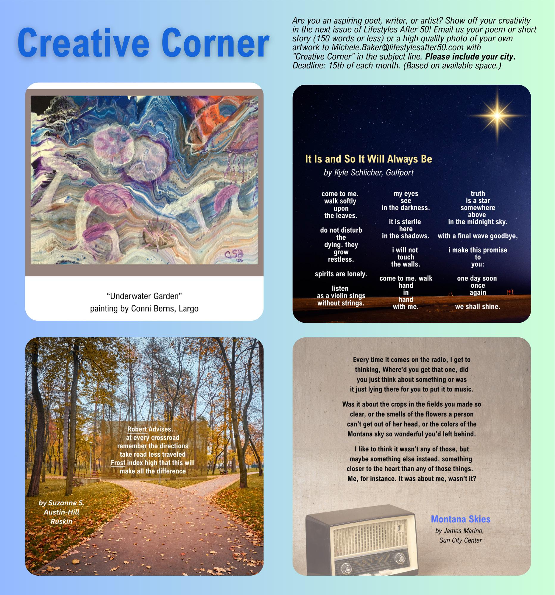 To PLACe An AD: Send your ad, stating what edition(s) you would like it placed in, along with a $6 fee for 30 words (25¢ for each additional word, abbreviations not charged) to the Lifestyles After 50 address listed below. Ads received by the 15th of the month will appear in the following issue.