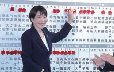 自民党の開票センターで、当選確実の候補者名に花を付ける高市早苗首 相=8日夜、東京・永田町の同党本部[代表撮影]「時事通信」(JIJI)