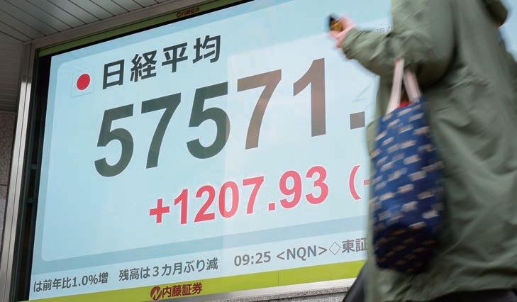 前日比1000円超の5万7000円台で推移する日経平均株価を示すモニター=10日午前、東京都中央区「時事通信」(JIJI)