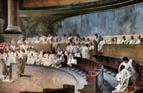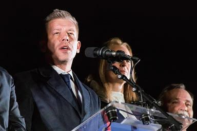 12日、ハンガリーの首都ブダペストで、議会選挙に大勝し、演説する中 道右派の新興野党「ティサ」(尊重と自由)のマジャル・ペーテル党首
