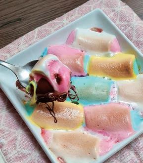 3 トースターで2~3分加熱し、マシュ マロに焼き色が付いたら取り出して出 来上がり。熱いうちにスプーンですく いながらいただく。トーストやクラッ カーに載せるのもおすすめ。