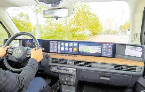 PÅ MOTORVÄG SÅ HÄNGER den med bra i trafikflödet och är en förvånansvärt lätt bil att köra, kamerorna i dörrarna ger bra sikt bakåt där innerspegeln, som även är en skärm, går lätt och att kan justera till allas tycke. Sikten runt om i Honda e är fenomenal, citerar min flickvän här ”Det känns som att sitta i ett akvarium med all glasyta som finns.” På tal om akvarium så går det även att ha ett virtuellt akvarium på den stora skärmen som finns längs instrumentpanelen. En liten gimmick som gillas av de flesta.