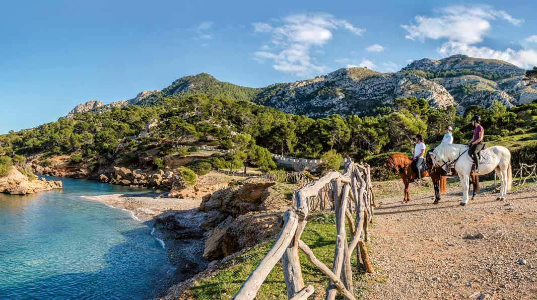 MÅNGA KÄNNER TILL MALLORCA som en sol- och stranddestination men Medelhavsön bjuder också på fantastiska naturupplevelser för den hästintresserade. På flera platser erbjuds organiserade dagsturer på en till tre timmar där ni rider genom skogar, längs naturstigar och på stranden. För den som är riktigt intresserad av hästar och ridsport finns möjlighet att bo på lantgård.