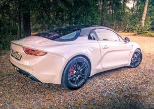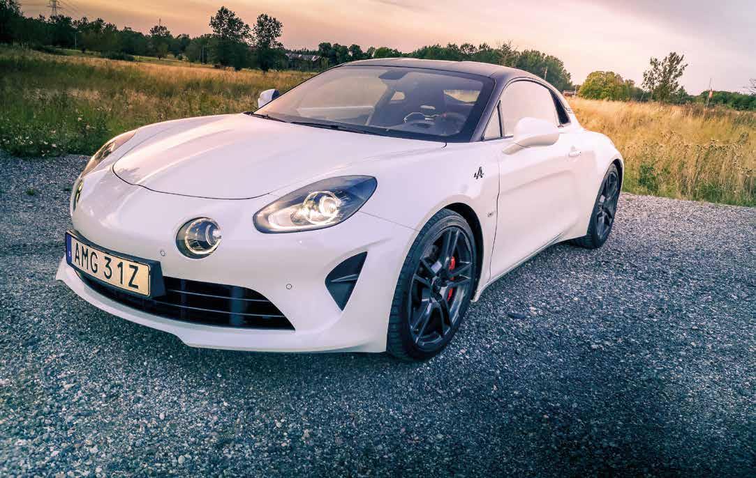 IBLAND NÄR MAN TESTAR och skriver om bilar kan man behöva lite hjälp på traven. Denna gång hade jag turen att ha min far på besök, med flera års erfarenhet av rally, både som förare och kartläsare, samt en hel del endurokörning. Så det tackar jag inte nej till. Så vad är då skillnaden på en vanlig A110 mot en med S i namnet? På utsidan är det minimalt, emblemen är nu svarta istället för kromade. Taket samt A & Cstolpen har fått en kontrasterande härlig svart färg och kolfiberväven lyser igenom från vissa vinklar. Men under skalet är det desto mer roligheter. Den mysiga 1,8 litersmotorn har fått lite hjälp med andningen. Så nu genererar motorn 300 hästkrafter, medan vridmomenten är kvar på 320 Nm, detta pga av att Getragväxellådan är begränsad till 320 Nm, till det positiva hör nu att vridmomentskurvan är ändrad och maximalt vridmoment levereras nu från 2000 rpm till 6400 rpm, vilket är 1400 rpm högre än i vanliga A110. Gräver man lite djupare så har chassit fixats till en hel del. Med omkalibrerad krängningshämmare och fjädrar, specialutvecklad axelgeometri, 50 % styvare spiralfjädrar, stötdämpare anpassade därefter, ihåliga krängningshämmare för att minimera vikten ( 100 % styvare), 4 mm lägre markfrigång och hydrauliska styrstopp för optimal karosskontroll.