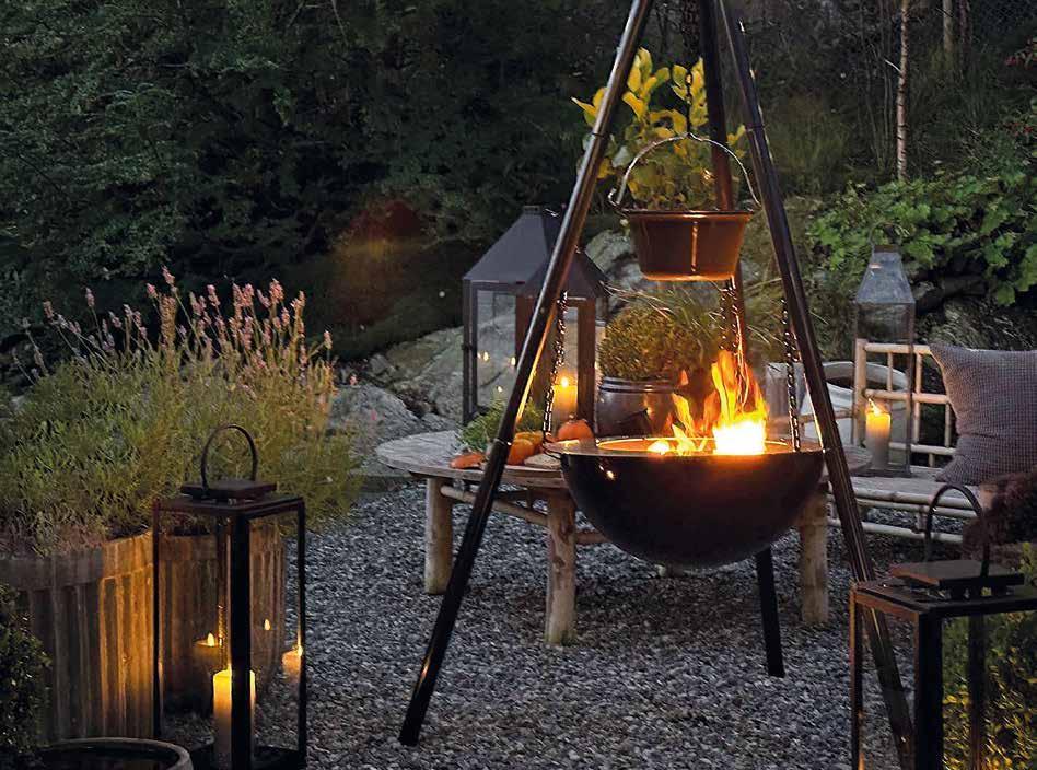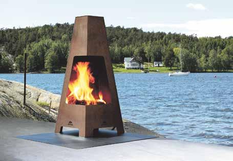 grill med sidobänk, vindskydd och grillgaller, lika enkelt som genialt! Andra exempel på okonventionella eldstäder är Espegards sortiment av bålpannor och Jøtuls vedkaminer i cortenstål, ett material som även Glowbus och Tommre tillverkat sina vedkorgar av. Även gaskaminer från Planika finns tillverkade i corten. ”En eldstad i corten klarar av att stå ute året om och blir bara vackrare med åren”, säger Jonas Svensson. ◆