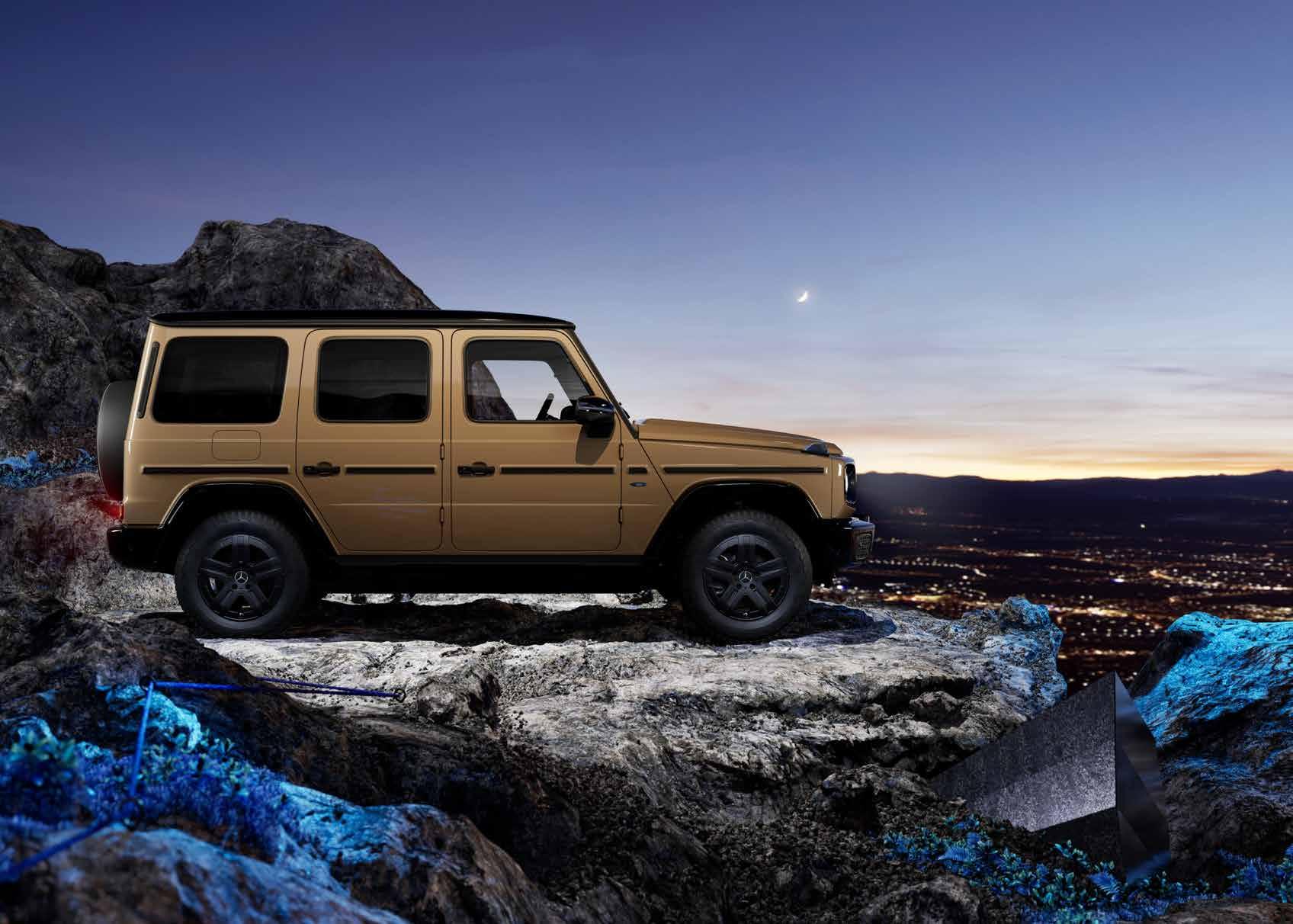 Mercedes-Benz G 580 with EQ Technology | WLTP: Strömförbrukning: 27,7-30,3 kWh/100 km | CO₂-utsläpp: 0 g/km (vid blandad körning). Bilen visas med extrautrustning. Information kring våra förarassistans- och säkerhetssystem återfinns på mercedes-benz.se. Med reservation för slutförsäljning, skrivfel och justeringar.