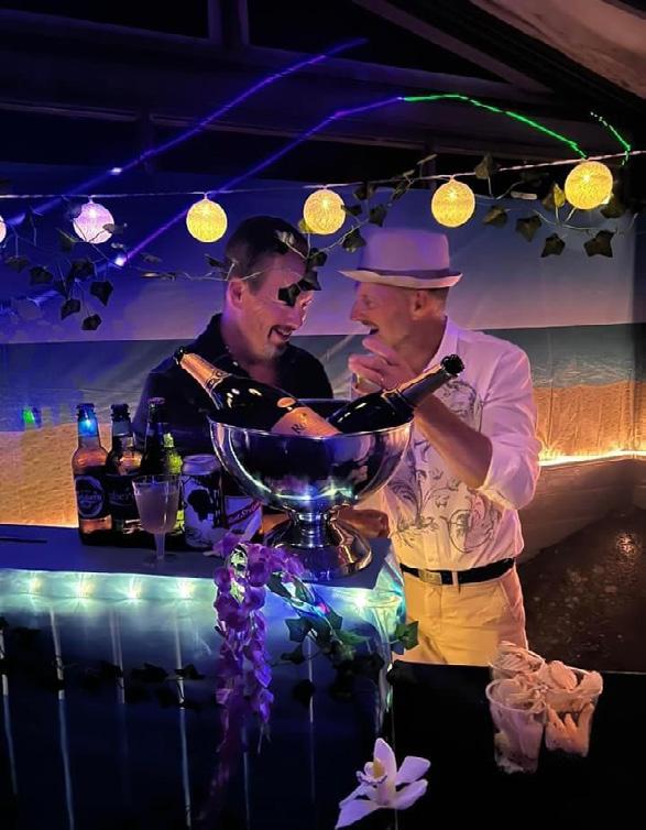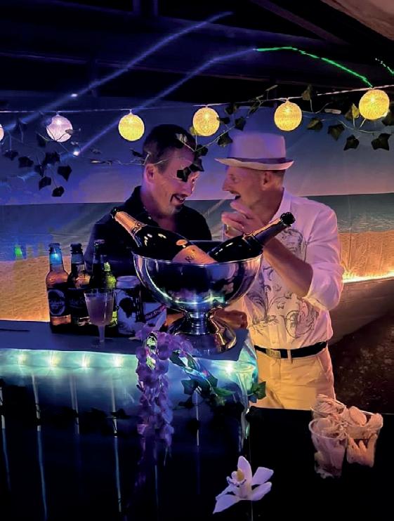 DEN 17 SEPTEMBER förvandlades paviljongen på Högböte till en pulserande grekisk taverna. Beachen var på plats, lyktorna var tända och hela taket grönskade. Efter sedvanlig rivstart med mingel och bubbel åts det grillat och skålades glatt under middagen. Allsång med ABBA-låtar som perfekt övergick i dans i laserskenet. Fredrik och Tony var i absolut högform och höll dansgolvet fullt långt in på småtimmarna.