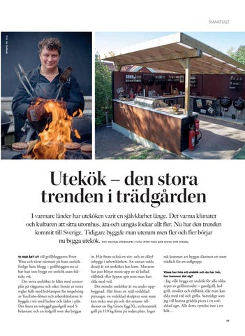 Utekök – den stora trenden i trädgården I varmare länder har uteköken varit en självklarhet länge. Det varma klimatet och kulturen att sitta utomhus, äta och umgås lockar allt fler. Nu har den trenden kommit till Sverige. Tidigare byggde man uterum men fler och fler börjar nu bygga utekök. TEXT: MICHAEL STENEMUHR | FOTO: PETER WATZ (DÄR ANNAT INTE ANGES).