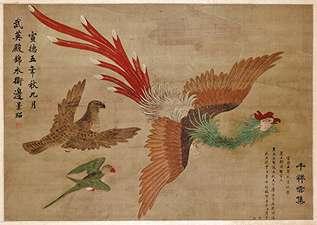MÅLNING med motiv av en fenghuang, Qingdynastin, troligen 1700-tal. BÅDE MYTOLOGISKA och verkliga djur är återkommande dekorativa och symboliska element i den antika kinesiska konsten. De kan stå för styrka, visdom, kärlek och godhet men kan också symbolisera det abstrakta såsom årstider och riktningar. Generellt sett är lyckosymboler populära. Den mytologiska fågeln fenghuang används ofta som lyckobringande symbol vid bröllop. Till skillnad från drakar i nordisk mytologi som nästan alltid är onda och eldsprutande bestar, symboliserar drakar i Kina makt, harmoni, fred och vishet. Fladdermusen är en vanlig symbol för tur. Om den uppträder i en grupp om fem står det för de fem välsignelserna: ett långt liv, rikedom, hälsa, kärlek och en naturlig död. Listan över kinesisk djursymbolik skulle kunna fortsätta i all oändlighet. I vilket fall som helst är det en intressant och vacker tradition som gör tolkningen av ett kinesiskt konstverk ännu mer spännande.