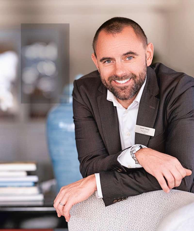 SÄKERT HADE ÅREN blivit fler om inte ägaren till Grand Hotel Saltsjöbaden ringt och frågat om han var intresserad av att söka vd-tjänsten. Erik förstod att det var en utmanande tjänst men han fick en hint om framtidsplanerna och tackade ja. När jag frågar vilka de är ler han lite hemlighetsfull. Det är för tidigt att berätta men han lovar att renoveringen kommer att ta hänsyn till byggnadens unika historia.