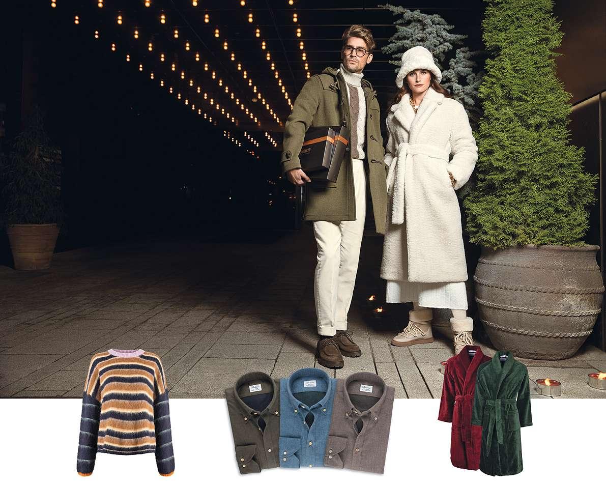 FÖR KVINNAN SOM GILLAR FÄRG OCH MÖNSTER. Stickad tröja från Stine Goya. Pris 2 899 kr. TILL VARDAGS FÖR DEN STILSÄKRA MANNEN. Stilrena flanellskjortor från svenska Stenströms i sagolikt mjuk bomull. Julpris från 1 299 kr (ord. pris från 1 599 kr). FÖR SKÖNA MORGNAR. Morgonrockarna från Pelle Vävare är en svensk klassiker. För både män och kvinnor. Finns i flera modeller och färger. Pris från 1 799 kr.