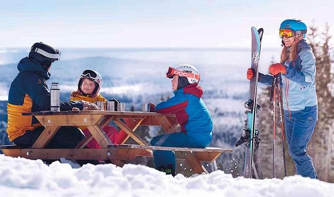 GOD MAT BEHÖVER man inte sakna under sitt besök i Kungsberget. Här finns sex olika alternativ att välja emellan – allt från hämtpizza och grill uppe på toppen till tre-rätters middag. Vad sägs om en kopp varm choklad med vispgrädde eller en god drink för att avsluta dagen? Området har även gott om grillplatser, bland annat på solsidan av berget. I kiosken på toppen kan man låna mackjärn och stekpannor för att steka pannkakor över öppen eld. Pannkaks-smeten? Den tar man med sig själv eller så köper man smet på plats, mycket populärt, särskilt för de allra minsta besökarna. Mikael tycker att det är viktigt att barnen får en bra start i skidbacken.