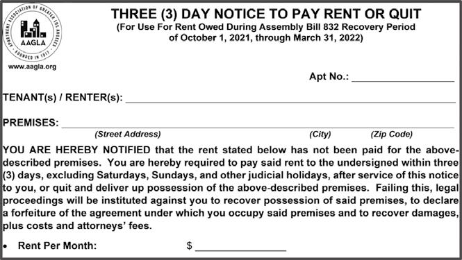 可以給租戶3天的通知,讓其支付租金或退出(搬走)。 該通知告知租戶,租戶有3 天時間支付全額租金或搬走。 如果租戶在3天期限前搬走,房東可以用押金來支付未付 的租金,並對超過押金的欠款起訴租戶。如果租戶不付 租金也不搬走,房東可以在 3 天期限結束後提起驅逐訴 訟。