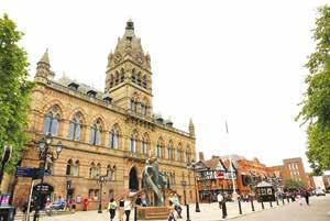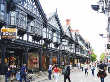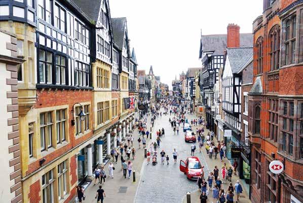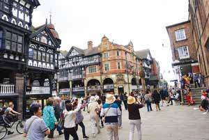 具代表性的建築,幾乎每座城市都有,但像切斯特 這樣滿街都是的倒不多見。古城裡的建築都有數百 年的歷史,除了都鐸式及安妮女王式,亦有羅馬式 的建築,每棟建築的造型皆美不勝收,吸引著遊客 個個舉起相機拍照。街上常見藝人在一旁賣唱,那 些藝人的表演都不俗,吸引著遊客駐足傾聽,並紛 紛慷慨解囊。走在石板路上聽著飄揚的悅耳歌聲, 欣賞一棟棟的美麗建築,不知不覺地沉醉在中古世 紀的浪漫中。