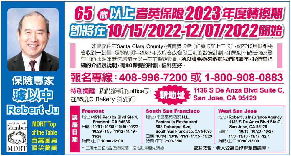 地址為: Robert Ju Insurance Agency 1136 S. De Anza Blvd. Ste C, San Jose CA 95129 另外舊金山2個地點與奧克蘭1個地點需要先預約。 美國醫療白卡 (Medicaid) & 紅藍卡 (Medicare) 申請條件和福利 (上) 編輯組整理 11www.newsforchinese.com 理財 誠徵特約記者、編輯、業務可在家上班,意者請電郵jean.ho@newsforchinese.com