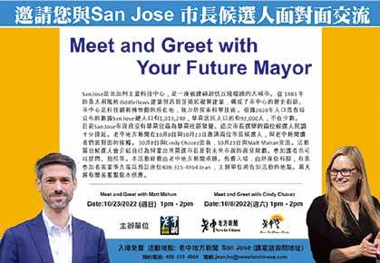 2022年10月1日-10月14日 老中電子報手機上免費閱讀 issuu.com/newsforchinese San Jose 是北加州主要科技中心,它是一座被連綿起伏丘陵環繞的 大城市。 從 1883 年的意大利風格 Oddfellows 建築到西班牙殖民復興建 築,構成了市中心的歷史街區。 市中心也是科技創新博物館的所在地,致力於探索科學技術。根據 2020年人口普查局公布的數據San Jose 總人口有1,013,240,華裔居民佔 了 92,000 人,不在少數。目前在 San Jose 市政府沒有華裔官員為華裔社 區發聲。這次市長選舉的兩位候選人民調十分接近。老中地方新聞為鼓 勵華人對地方政治的參與感特別舉辦了這一次與市長候選人面對面溝通 的重要活動。活動將在 10 月 8 日與 10 月 23 日邀請兩位市長候選人,與老 中新聞讀者們面對面的接觸。10月8日與Cindy Chavez面敘,10月23日與 Matt Mahan見面。活動當日候選人會介紹自己為何要出來競選市長及對 未來市政的政見規劃。參加讀者也可以提問、拍照等。本活動經費由老 中地方新聞承辦。活動當日由老中廣播電台主持人汮汮開場主持。參與 者若有語文溝通的問題,中英文流利的汮汮將為各位做翻譯。由於座位 有限,歡迎有意參加的讀者們提早報名。 Cindy Chavez 見面日為10月8日周六下午1pm。 Matt Mahan見面日為10月23日周日下午1pm。 活動免費入場,由於座位有限,有意參加者需要事先電話預訂座位 408-315-4964 Jean 或電郵 jean.ho@newsforchinese.com 主辦單位將告知 活動的詳細地點。當天將有簡易餐點飲水供應。 沒有什麼比能送孩子上大學更讓父母開心的了。幫助您的孩子獲得 更高的學位可以讓他們擁有一個更加積極的未來,也有更大的機會拿下 穩定的工作和收入,這也就是為什麼確保孩子們在進入大學和大學畢業