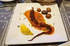 前菜點了香烤西班牙章魚,作法是比較西班牙傳統的 做法,吃起來稍微有點綿綿的。旁邊搭配小馬鈴薯,上面 淋上烤青椒杏仁醬。