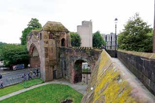 羅馬城牆 隔開古今 古城的主要購物大道,直通東門。東門上有座 金碧輝煌的鐘樓,上有金色的 VR 字樣,是慶祝維 多利亞女王登基六十週年於 1877 年建造的。東門 旁有樓梯可以爬上城牆,這座在中世紀重修的羅馬 城牆,有四公尺多高,但城牆上的道路很窄,勉強 供兩人比肩擦而行。站在城牆上居高臨下,城裡 城外看得一清二楚。城裡是中世紀的世界,城外是