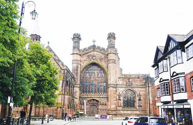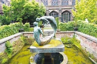 此中定有深意,也可能要讓世人自己去體會吧!歐 洲到處都是教堂,並且一座比一座大。切斯特教堂 並不特別大,但它深邃的甬道,莊嚴的大廳,美麗 的花園,處處都有與眾不同的特色。 別了、切斯特 回到市政大樓前,廣場上一座現代藝術的人物 雕塑,將人拉回了現實。不過咫尺之遙,境界卻 大不相同,真令人有穿越時空之感。迴望古城,在 那裡時光可以倒回幾百年,古香古色中處處閒情逸 趣。古城雖美,也僅是我們旅途中的一站,又到了 該上車離去的時刻。遊覽車轉出市中心往高速公路 開去,別了古城,半日的邂逅,我已心滿意足。覽 車漸行漸遠,一回頭,市政廳的鐘樓竟仍然高聳在 蒼穹下,似乎遙遙地為我們送行。 典樂 之二 捕捉中世紀的浪漫漫遊切斯特古城 切斯特的東門鐘樓 切斯特中世紀的古城牆 切斯特大教堂 大教堂之內部一角切斯特大教堂的美麗花園 餐廳中桌上的插花 7www.newsforchinese.com 旅遊