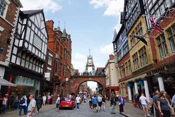 別處的都鐸式建築以木樑粉牆做基礎,但顏色 上有許多變化,只有在切斯特一式的黑木白牆, 而且數量不但多更在大街小巷中成排成片。由於 樓高屋大,黑色木樑在白粉牆上組成的圖案及幾何 圖形就有很大的發揮空間,變化多端各式各樣。傳 說羅馬帝國滅亡後,城池慢慢荒廢,商人利用羅馬 古建築的石材重新建造一樓的店鋪,後來再用木料 修建二樓。所以大部份的建築一樓是羅馬式的水泥 建築,二樓以上則是木料,這些建築多半建於中世 紀,至今多有七八百年的歷史。並且許多都鐸式建 築的一樓還有用羅馬柱架起的長廊,這些特殊的建 築稱做Chester Row, 是切斯特的特色,同樣的建築 亦是從切斯特發展到其他城市。