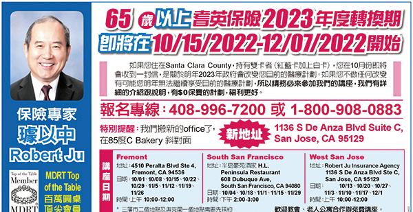 10/20, 10/27, 11/3, 11/10, 11/17, 12/1/2022 時間: 上午10:00am – 12:00pm 地址為: Robert Ju Insurance Agency 1136 S. De Anza Blvd. Ste C, San Jose CA 95129