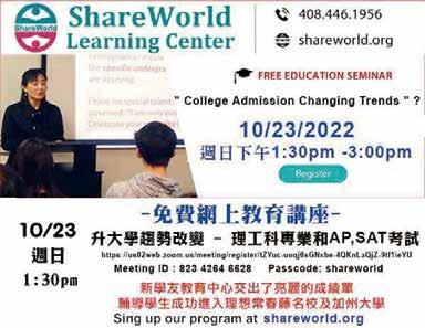 2022年10月15日-10月31日 老中電子報手機上免費閱讀 issuu.com/newsforchinese 南灣地區著名的教育輔導中心,新學友教育中心(Share World Learning Center ) 將於 10 月 23 日在線上舉辦一場免費的教育講座『升大學趨勢改變 – 理工科專業與 AP, SAT考試』。目前有要準備升大學的高中學生需要提早做好準備。新學友教育 中心過去多年來,為許多入大學前的學生提供的完整輔導及大學申請準備交出了亮 麗的成績單。成功輔導許多學生進入了理想的常春藤名校及加州大學。這此線上講 座將於 10 月 23 日週日下午 1:30pm 舉行。有意參加者可以上網登記。