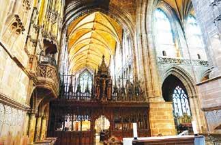 走出古城回到市中心,我們趕緊去參觀切斯特 大教堂。大教堂始建於西元 660 年,當初是為了獻 給聖保羅及聖彼得的羅馬教會。羅馬帝國滅亡後久 而久之,教堂的功能亦跟著改變,於 1093 年改建成 英國本篤會修道院。亨利八世與教宗決裂後推翻了 天主教,大教堂也沒有逃過燒毀的命運, 1541 年後 重新修建成綜合羅馬式與哥德式的風格。教堂的古 老紅磚上黑跡斑斑,好似當年被燒毀過的痕跡,一 看就是座歷史悠久的古建築。教堂內的拱廊甬道陰 森斑駁,更顯出教堂的古老。教堂的大廳上仍保留 著英國最古老的宗教法庭,一方黑色木桌,主教坐 在前方的高台上就是當年的宗教法庭了。教堂主殿