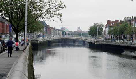 (O´Connell Bridge) ,皆是都柏林市中心一道道亮 麗的風景。走過半分橋到達北岸,遙遙望見都柏林 海關大樓,新古典式的建築,綠色的羅馬圓頂高聳 天際,是都柏林最美麗的地標建築,廣受觀光客及 攝影家的青睞。以前過這座橋需要繳半分錢的過橋 費,故名半分橋,如今過橋已不再需要繳買路錢 了。沿著河邊散步或買杯咖啡在岸邊的樹蔭下小 坐,閒適、浪漫的情懷,油然讓人感到正在遠方旅 遊,受享著異國的風情。