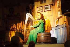 “Taylors Three Rock" 是都柏林頗有名氣的酒吧,亦是有名的美食 餐廳。 舞台的佈置就像是尋常人家的客廳,美麗的姑 娘坐在廳中一角彈奏著豎琴,優美的樂聲錚瑽如流 水。男女舞者隨著樂聲,自後臺翩翩舞出前台。愛 爾蘭的傳統舞蹈非常輕快,女子穿著大圓裙,男子 著白襯衫黑背心,都好似鄰家的男孩女孩,樸實可 親。拉著小提琴,彈著好似月琴的音樂家,唱著動