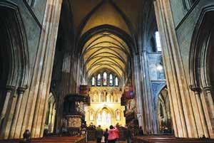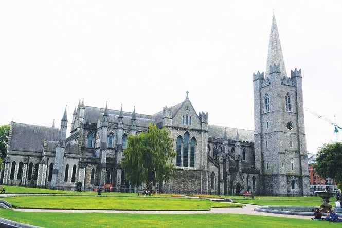 愛爾蘭是天主教國家,都柏林城裡的教堂很 多,走在街上三不五時便見到不遠處一座哥德式的 鐘樓高入雲霄。城裡美麗的教堂很多,但最有名的 教堂則是聖派翠克教堂。從吉尼斯啤酒廠出來走上 湯姆斯大道往市中心的方向走,大約十多分鐘便到 了派翠克街,一眼便能看到聖派翠克教堂如針尖的 鐘樓高聳在前方。 聖派翠克教堂外面的花園非常大,園裡綠草如 茵,繁花似錦。廣大的草坪中間,有座圓形的噴水 池,教堂外面猶如一座小公園。 古老的傳奇 聖派翠克教堂 每年三月美國的超市與商場,便開始以酢醬草 心形的葉片圖案裝飾店面。巧克力糖,西點餅乾也 多以綠色包裝,滿街一片翠綠。而此時的大地亦剛 從寒冬中甦醒,草地上、樹梢上皆是一片新綠。春 天來了,粉紅色的、黃色的酢醬草花亦在這時漸漸 地開滿在田野。聖派翠克節,就在這一片綠意中登 場。這一天,孩子們穿著綠色衣服去上學。大型購 物中心多半會舉行慶祝活動,拉著小提琴及彈奏手 風琴的小樂團奏著悅耳的音樂,男子著綠色背心, 女子著綠色圓裙,隨著音樂跳著輕快的土風舞。美 國的聖派翠克節有如迎接春天到來的喜慶,幾乎忘 了節慶是為了紀念愛爾蘭的傳教士聖派翠克。 到了都柏林才知聖派翠克節是愛爾蘭最重要的