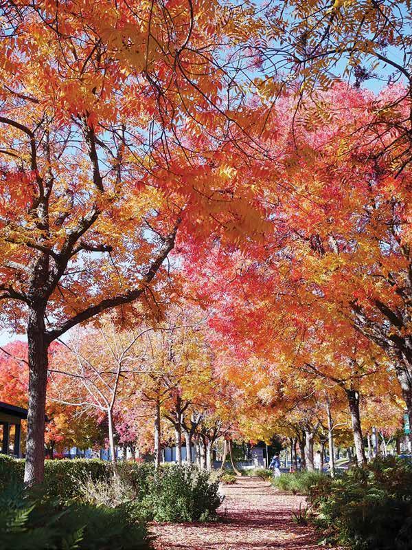 身為矽谷灣區人,十一月份最受歡迎的 行程之一就是追秋色。紅葉與銀杏隨處可 見,美不勝收。 史丹佛校園紅葉 ▲ 史丹佛校園Bowdoin St與Stanford Ave 交叉口賞秋。 史丹佛校園腹地廣大、校園優美,是不 少人們愛拍照取景的地點,而秋天最知名的 取景點就屬於位於Bowdoin St與Stanford Ave 的紅葉大道。根據以往的經驗,大約十一月 初就是紅葉景色最盛的時候。今年拍攝日期 在十一月十九日,已晚了約兩週,尚有幾棵 樹還盛開,建議明年邁入十一月份就可準備 來此取景。附近找尋路邊停車即可。 圖書館周圍賞秋喝咖啡 ▲ Cupertino 圖 書館外城市的紅葉大 道,順便上咖啡店喝 杯香濃咖啡 。 經常駕車駛於矽谷 Cupertino 城市社區 間,一個轉角就見紅葉或者是亮澄澄的銀 杏,隨處可見迷人秋色。最廣為人知的其中 一處就是庫市圖書館外周圍,楓紅色的紅葉 大道。除了飄散著書香,也能至一旁的咖啡 店Bitter + Sweet,點上一杯Sightglass咖啡豆 製作的香濃拿鐵,就是一個完美的週末早 晨。 撰文&攝影 / 法蘭小姐 矽谷心生活 ▲ 深秋時節,矽谷城市換上秋裝。(取景Cupertino Library) Los Altos夜色下的秋色 Los Altos 的 State Street Market外的紅葉。 2021年,Los Altos 市中心整修大變身的 高檔美食匯集地 State Street Market ,吸引不 少饕客與人潮來此, 想當初還居住在亞洲 的時候,最熟悉的便 是此種美食廣場的概 念,這次總算和朋友 一探究竟。週五傍 晚,路邊 Live 樂隊演 奏,美食廣場有臺韓概念的餐廳Bao Beii、Ostro Raw Bar 、甜點冰淇淋店 Tin Pot Creamery 等等,三五成群 的親朋好友在此聚餐聊天,新穎的廣場與戶外的紅 葉,傍晚的燈光、各種美食與飲品供選擇,真的是令 人不醉也難。 豪宅花園深秋色 Filoli 莊園節日 賞秋色。 有人問我什麼 時節最適合造訪 Woodside 的豪宅 Filoli 呢 ? 應該可說是一年 四季皆有花可賞,但 若依照過去的足跡, 我們最常是春天或秋 冬造訪豪宅花園。大 地回春之際,前往 Filoli 賞鬱金香或櫻 花;感恩節至聖誕節 時分,莊園通常開放夜間燈飾展,可賞紅葉秋色及大 型聖誕樹,非常適合年末闔家過節散心。 Fremont寧靜的Shinn花園 ▲ Shinn Historical Park and Arboretum賞銀杏樹與日式小亭。 Shinn 歷史公園和植物園是 Fremont 的隱藏版絕美 去處。維多利亞式宅邸、植物園和日式庭院皆在一 處,十分方便。深秋可見家庭在金黃銀杏樹下拍攝家 庭照,花園轉角又見日式庭院紅葉,濃濃的古樸氣 氛。 Shinn 家族是自 1850 年代經營進口樹木,這裡還 有樹齡近150 歲的巨木呢。 城市間 賞秋色 2022年12月1日 12月14日 14 www.newsforchinese.com 生活 喜歡寫作,歡迎投稿老中報,灣區數萬讀者將分享您的經驗 editor@newsforchinese.com