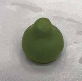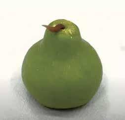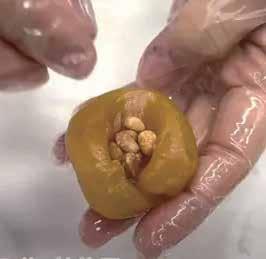 在頂端用竹籤戳個細小的洞約 1 公分。洞的周圍刷上食用金粉 (可省略)。將步驟 5 可可色麵 糰搓成細長條狀,約兩公分, 前段搓細,插入柚子頂端,冰 皮柚子完成。